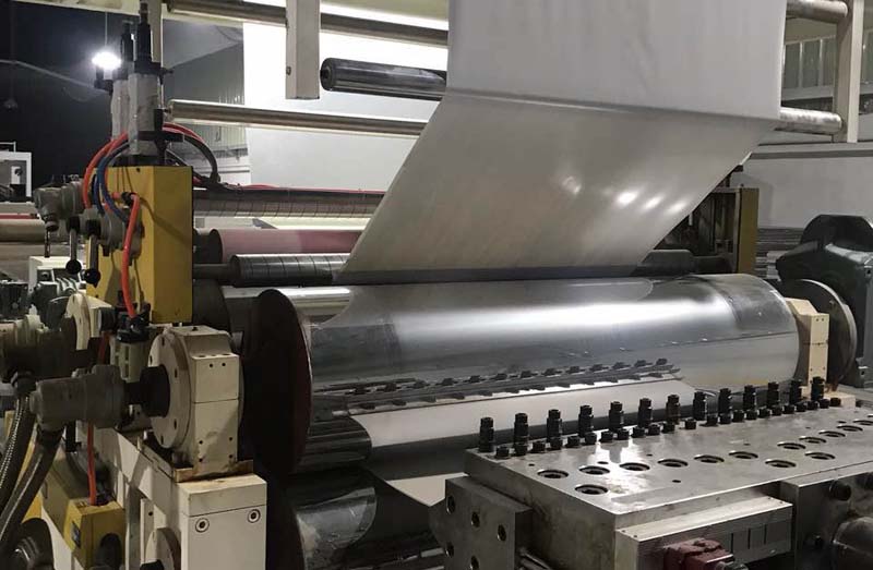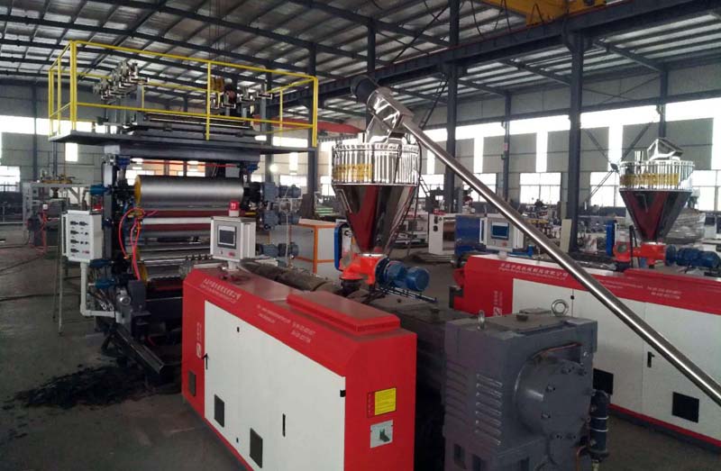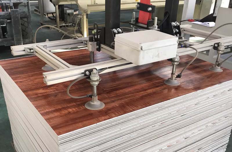 PVC石塑地板四輥加一輥生產(chǎn)線設備,擠出基材,熱敷彩膜裝飾層和耐磨層,實現(xiàn)一步法,在同一臺設備上同時完成。第一,表面可熱敷上各種不同顏色的彩膜裝飾層;第二,可直接在板材裝飾層上熱敷耐磨層;第三,可直接做上各種各樣浮雕木紋及各式各樣的花紋;第四,底層軟墊消音層,也可直接熱敷上去。以上四條均可同時在一條生產(chǎn)設備上完成多層結合為一體??蓽p少表層處理花紋,耐磨的設備。減少人工及設備的投資,大大降低PVC地板生產(chǎn)成本。